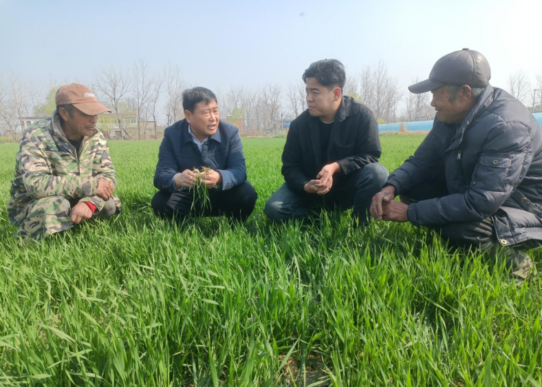 正在农技人员的指点下,当前沉点防治红蜘蛛、蚜虫和纹枯病,连片的小麦生气勃勃、长势喜人。